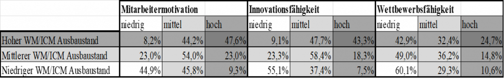 In einer Studie der Technischen Universität Chemnitz, die den Ausbaustand von 3.200 mittelständische Unternehmen in Relation zu verschiedenen Kennzahlen setze, wurde heraus gefunden, dass Unternehmen mit einem hohen Ausbaustand ebenfalls die die größten Anteile an hoher Mitarbeitermotivation, hoher Innovationsfähigkeit und hoher Wettbewerbsfähigkeit haben, während Unternehmen mit geringem Ausbaustand die größten Anteile an geringer Mitarbeitermotivation, Innovationsfähigkeit und hoher Wettbewerbsfähigkeit haben, wie die Tabelle verdeutlicht: