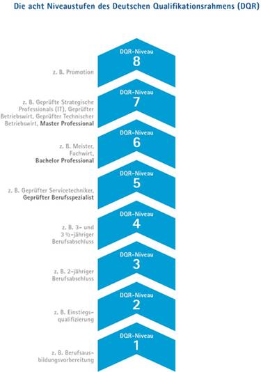 In Deutschland wurde beschlossen, ebenfalls ein achtstufiges Modell zu definieren. Diese Einstufungen umfasst der DQR – Deutscher Qualifikationsrahmen. Dieser beginnt, anders als der EQR, erst im Tertiärbereich des deutschen Bildungssystems. Während im EQR die erste Stufe gleichzusetzen ist mit den Grundlagen des schulischen Lernens in der Grundschule, ist im deutschen System Stufe eins mit der Berufsausbildungsvorbereitung vergleichbar.
