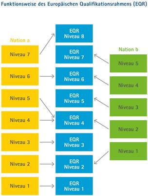 Als universelles Übersetzungsinstrument erleichtert der EQR den Vergleich der Bildungsniveaus verschiedener Länder. Die acht EQR-Niveaus sind durch die Bereiche Wissen, Fertigkeiten sowie Verantwortung und Selbstständigkeit definiert und ermöglichen so eine klare Zuordnung zu den Bildungsniveaus anderer Länder.[2]